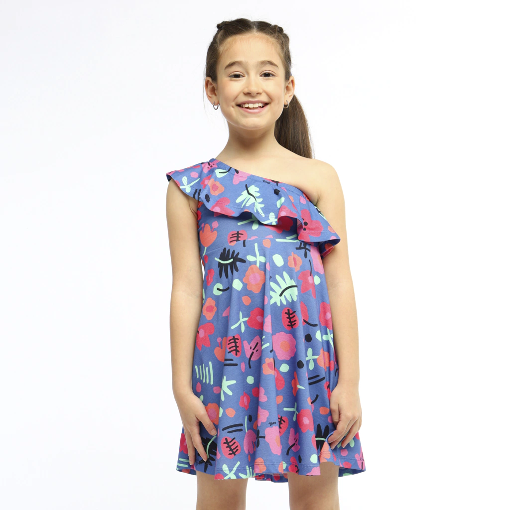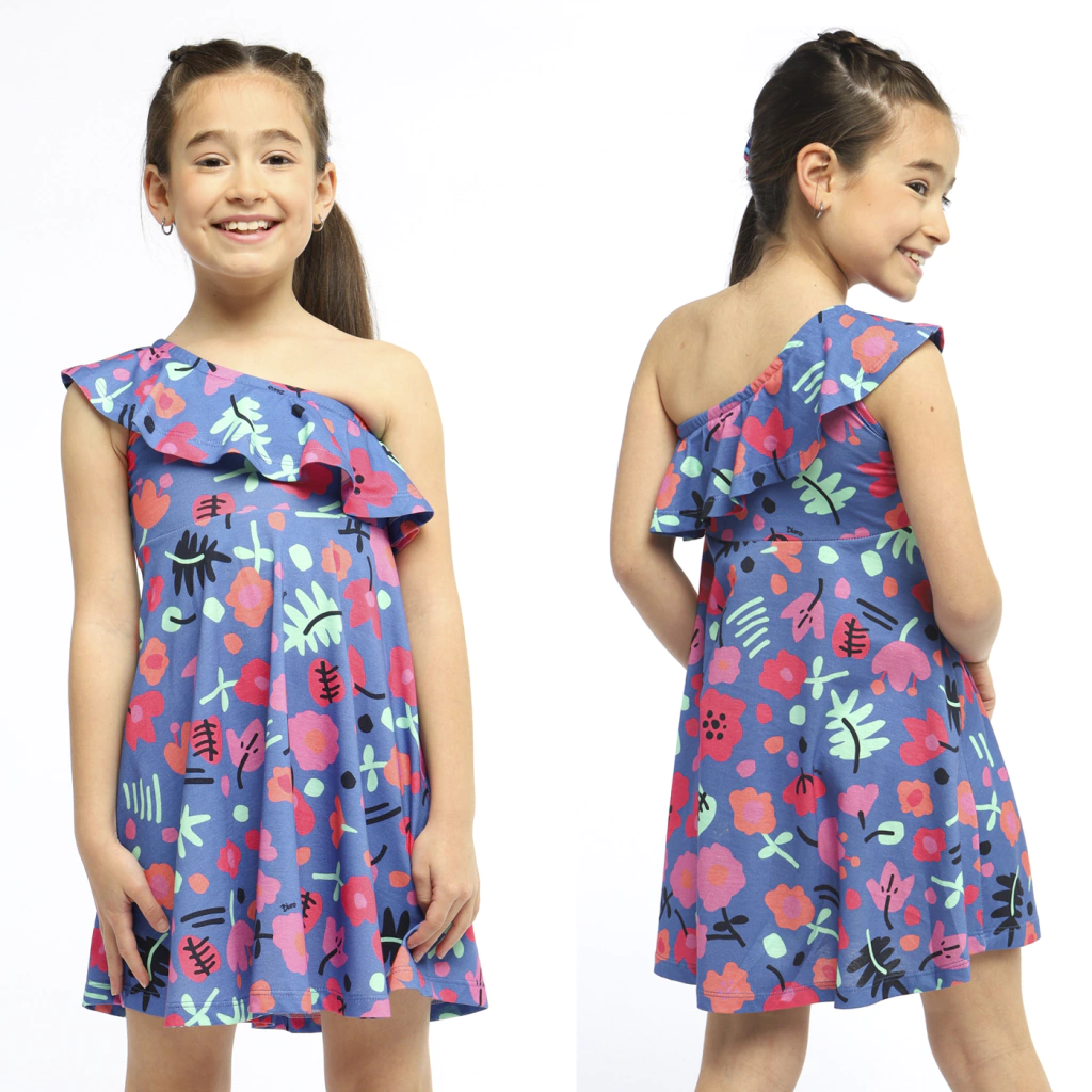 Vestido de jersey de algodón, estampado exclusivo Bluma. Un hombro y volado.