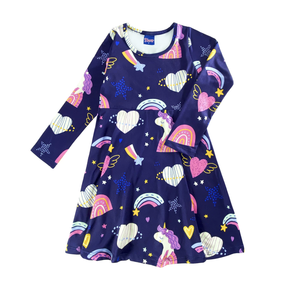 Vestido de modal gamuzado con un estampado que combina unicornios, estrellas y arcoiris en colores muy vivos y divertidos para arrancar esta temporada bien alegres. Es una tela suave con un tacto muy lindo a la piel, mucho movimiento y de excelente calidad.